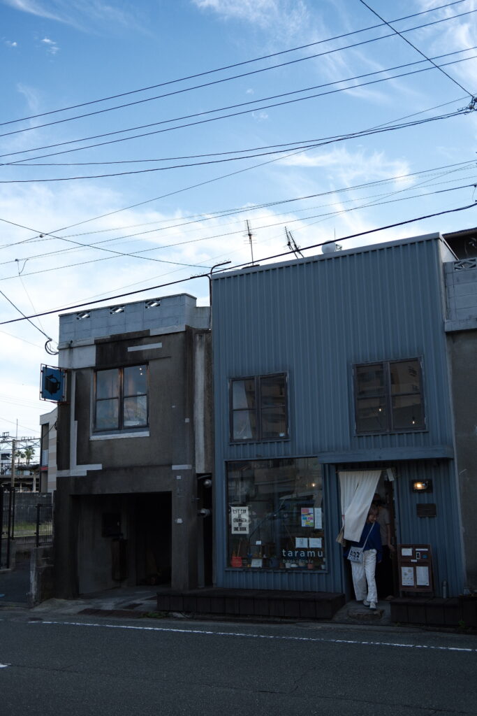 左手の建物2階がカフェスペース。窓からは大牟田駅が見える。わたしが好きなのはここのお手洗い。もともとお風呂場だったスペースを改造していて、ちょっと広い。窓からは陽がさし、観葉植物が元気に育っている。ドアノブは、カバンの取っ手だ。