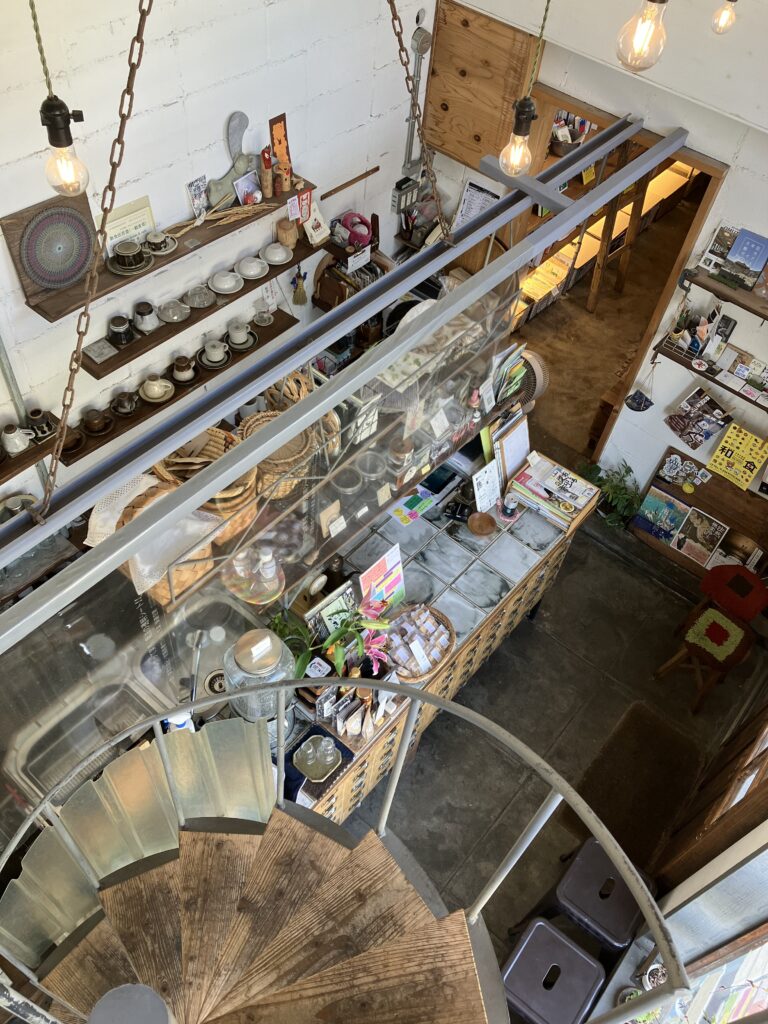 扉をあけて暖簾をくぐると、正面にドーンとカウンターがある。左手のほそーい螺旋階段をあがると、2階はカフェ兼イベントスペース。
