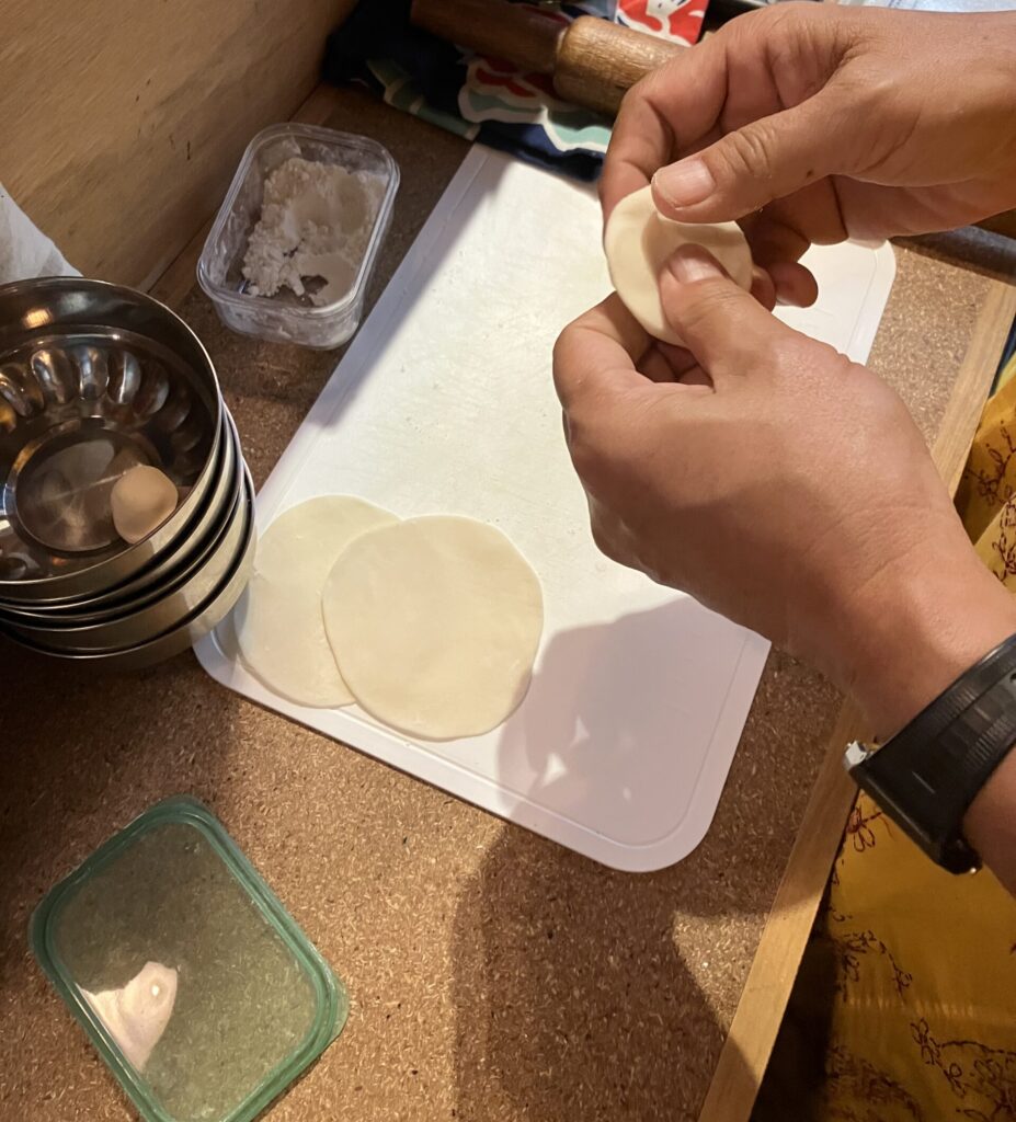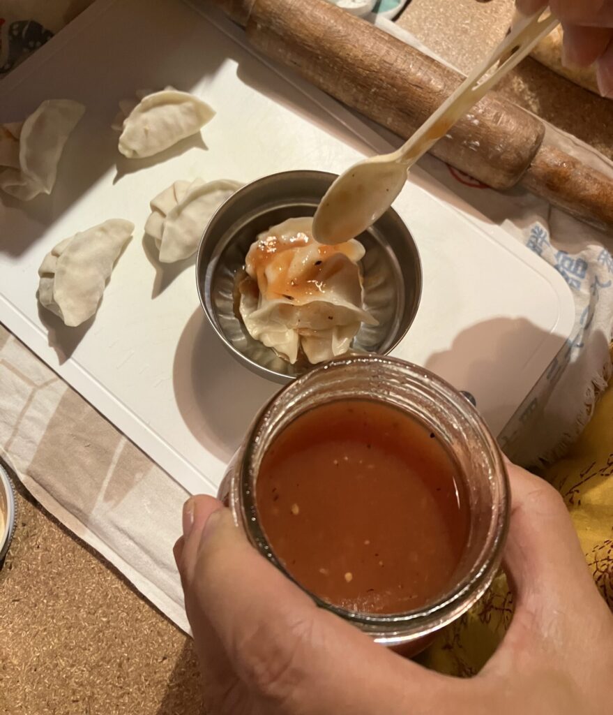モモっていうのは、小麦粉をこねた皮で肉や野菜のミンチを包んで蒸した、蒸し餃子のような料理です。チベットが発祥とされ、ネパールやブータンなどでもでよく食べられている国民食で、アチャールと呼ばれるトマトやゴマベースのディップソースにつけて食べます。ヤビロンは肉を使わないので、ベジタブルモモ「ベジモモ」です。