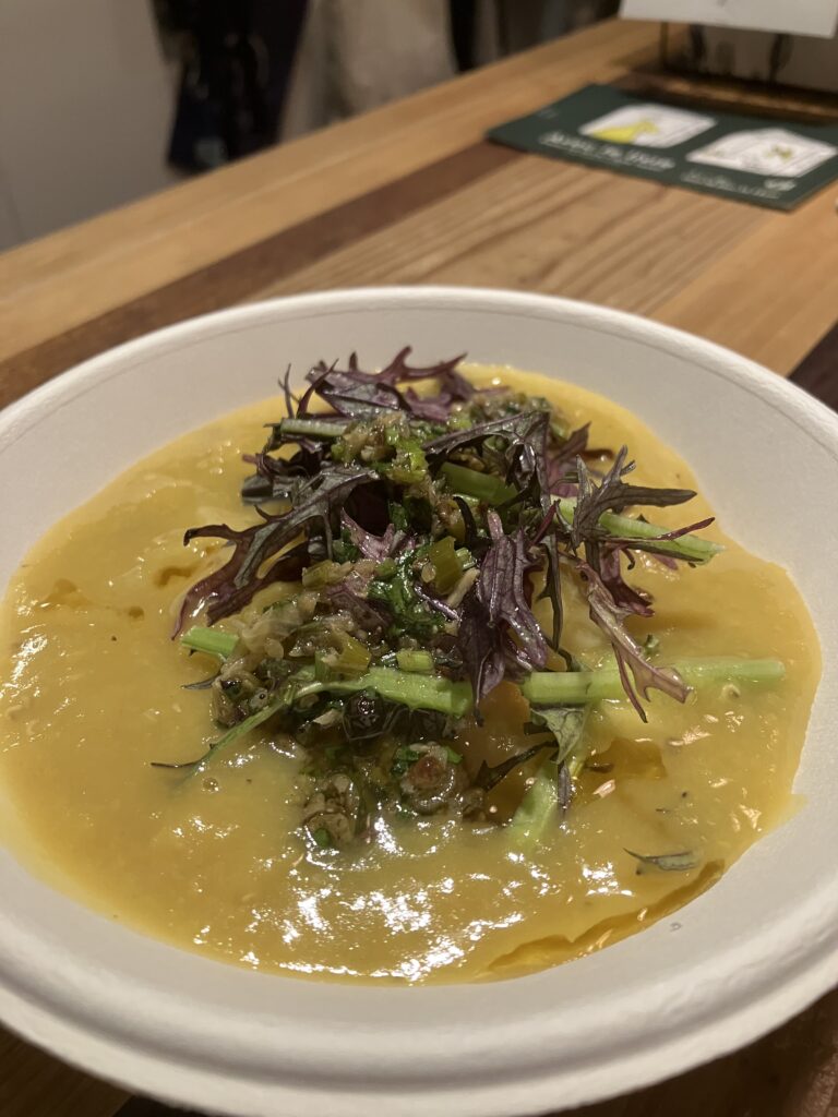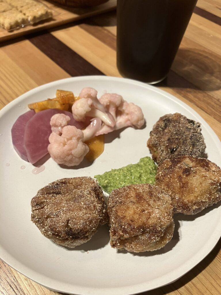 メニューは、ダル麺とレンコンボール。ダルは通常お米といっしょに食べるのですが、飲みの〆にもピッタリくるようにツルツルの麺にダルを絡めて食べるスタイルに。毎回いろんなメニューで楽しませてくれます。