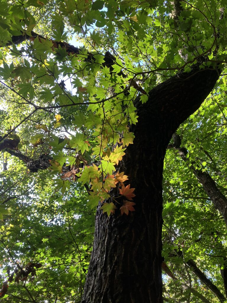 例年通りであれば、もう少し木々の葉っぱが色づいているはずだったのですが、今年の紅葉さんはのんびりやさんのご様子。緑ひろがる森歩きとなりました。とはいえ、小さい秋を見つけながら歩くのも楽しいもので、ところどころ色を変えた葉っぱを見ては「あるねぇ」「きれいねぇ」と声に出しつつ、それを共感しあいつつ前へ前へ進むのでした。