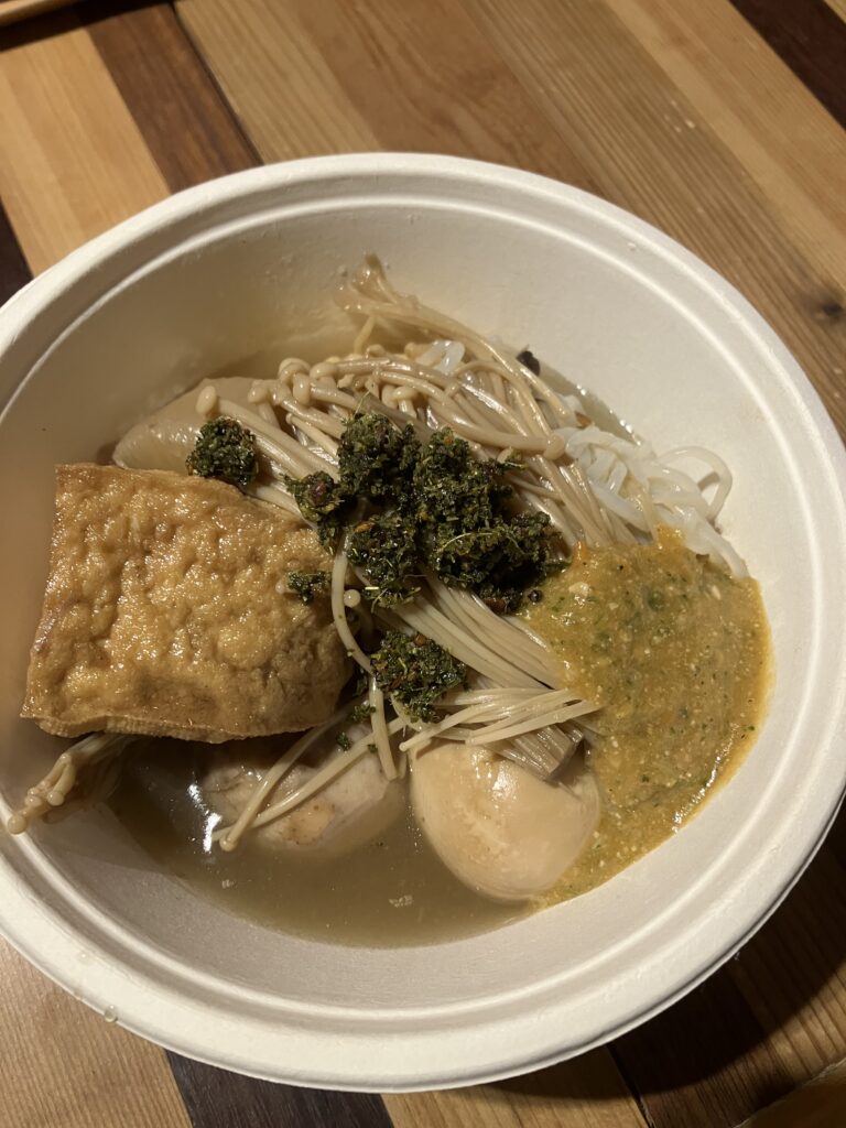 水曜日には、恒例のヤビロンおつまみがあり、ヤビロン特製「スパイスおでん」でビールを楽しみました。これが完成度めっちゃ高くて、確かにおでんなんだけども、唯一無二のヤビロンフレイバーなんですよ。たまごは入っているけど、それ以外は完全ベジ。つまり、お出汁も練り物も使わずに、お野菜とスパイスとお塩で完成されている。それなのに、しっかりと深みがある。(←ここに隠し味がきいているそうな)本人にとっても新しい挑戦だったようで、おいしくできたことをものすごく喜んでいました。