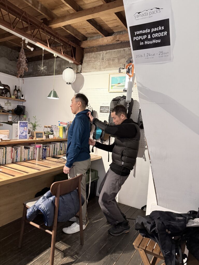 錦田さんも、yamadapacksが気になっている様子。お客様として来られている、yamadapacks愛用者のガイド安武さんが、錦田さんに商品説明をしている絵面が大変面白かったです。同時に、HouHouのお客様って本当に素敵やんってキュンとしました。わたしたち、みなさんが来てくださるから、いてくださるから、お店をあけるエネルギーを持ち続けられるんだと思います。