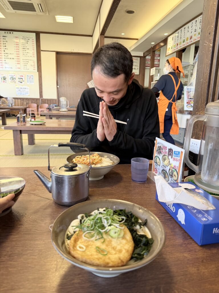 牧のうどんの座敷席や注文システムも、ひらおの文化も、キラキラした目で楽しむ山田さん。特にひらおでは、厨房が気になって仕方なかったようです。大好きな芋のてんぷらを追加してご満悦なのでした。