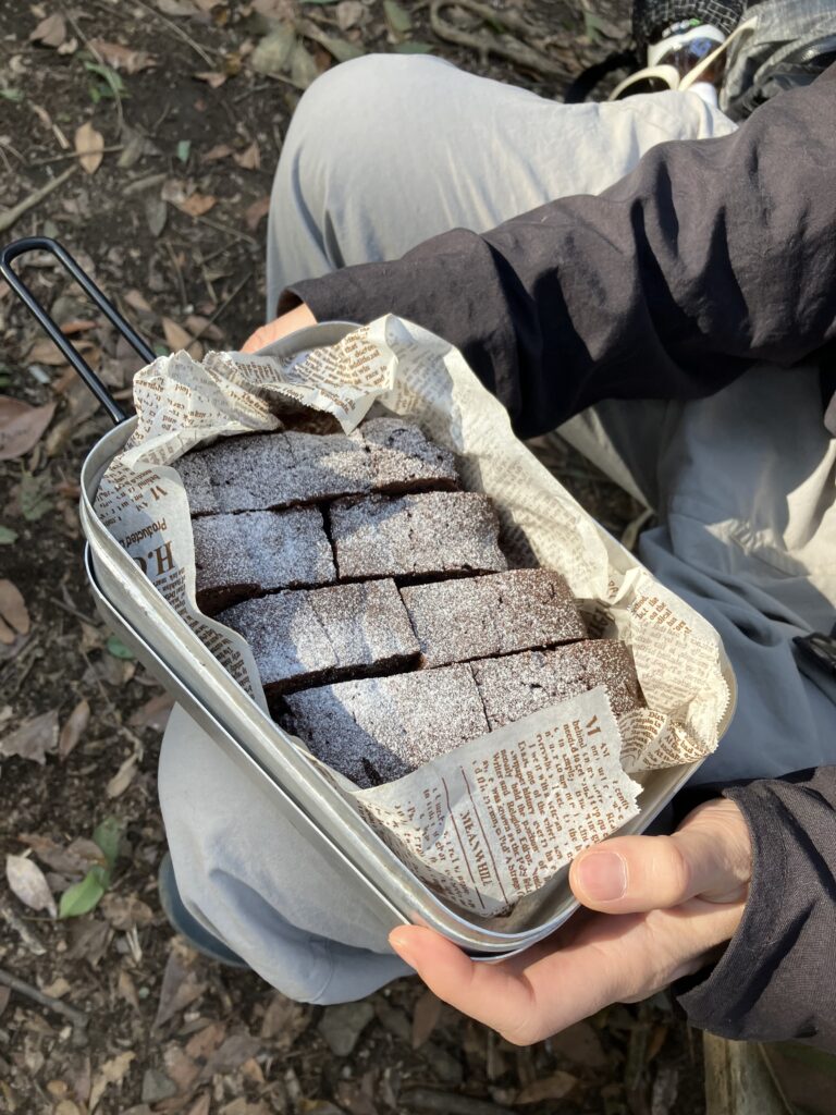 ここで、ちょっと一息。座り休憩。この日はバレンタインデーということで、チョコブラウニーを焼いてきてくれたゆーこさん。なんと、切り分けた個数と参加人数がピッタシカンカンです!!すごーい。